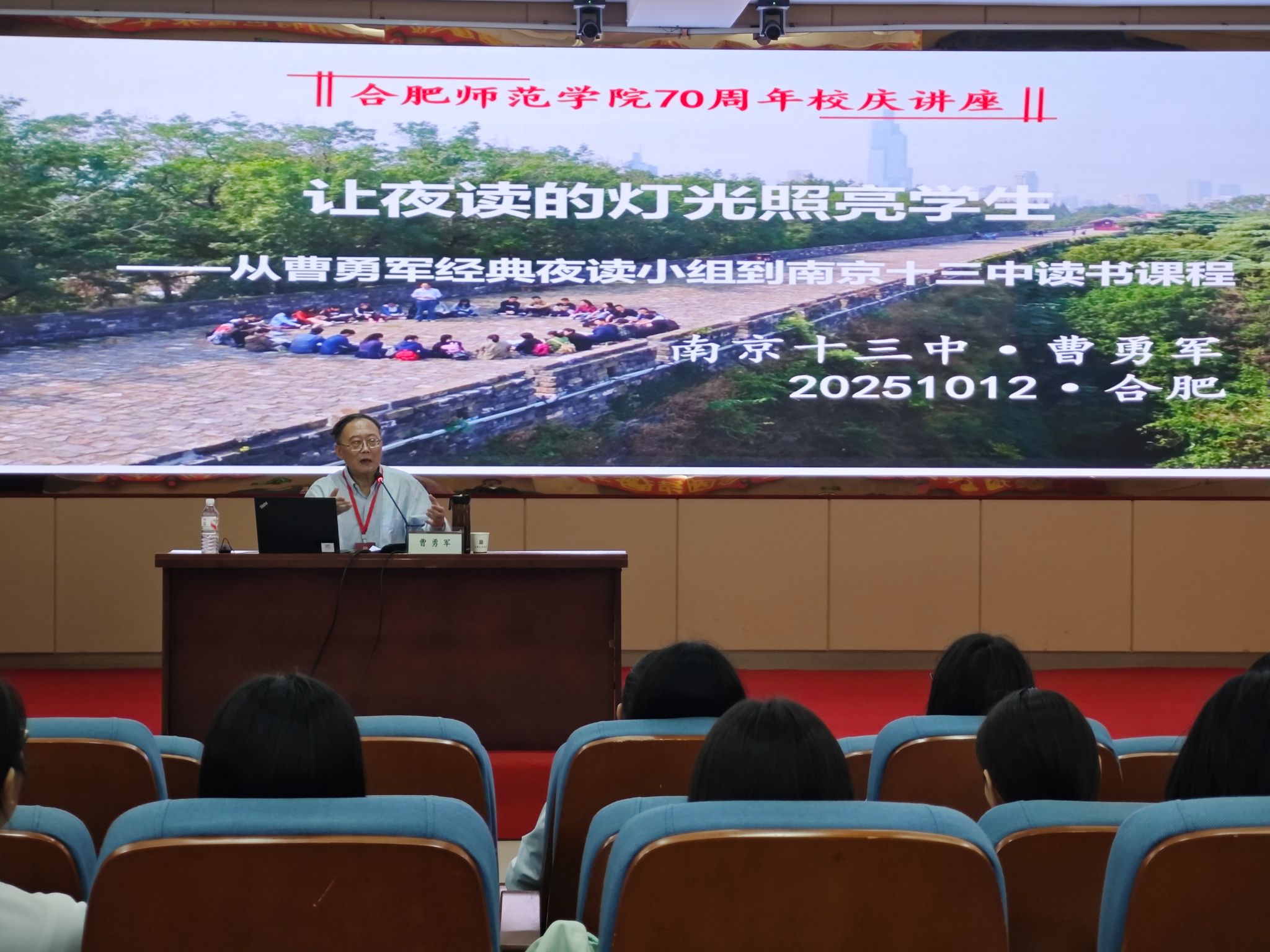 10月12日下午,由合肥师范学院科研处和文学院联合主办的70周年校庆学术讲座活动在锦绣校区学术报告厅举行。文学院1986届校友,江苏省特级教师、南京市十三中教授级高级教师曹勇军作了题为“让夜读之光照亮学生——从曹勇军经典夜读小组到南京十三中读书课程”的学术讲座。学院2024级、2025级学科语文教育硕士研究生和部分汉语言文学专业本科生参加讲座,讲座由文学院院长何旺生主持。