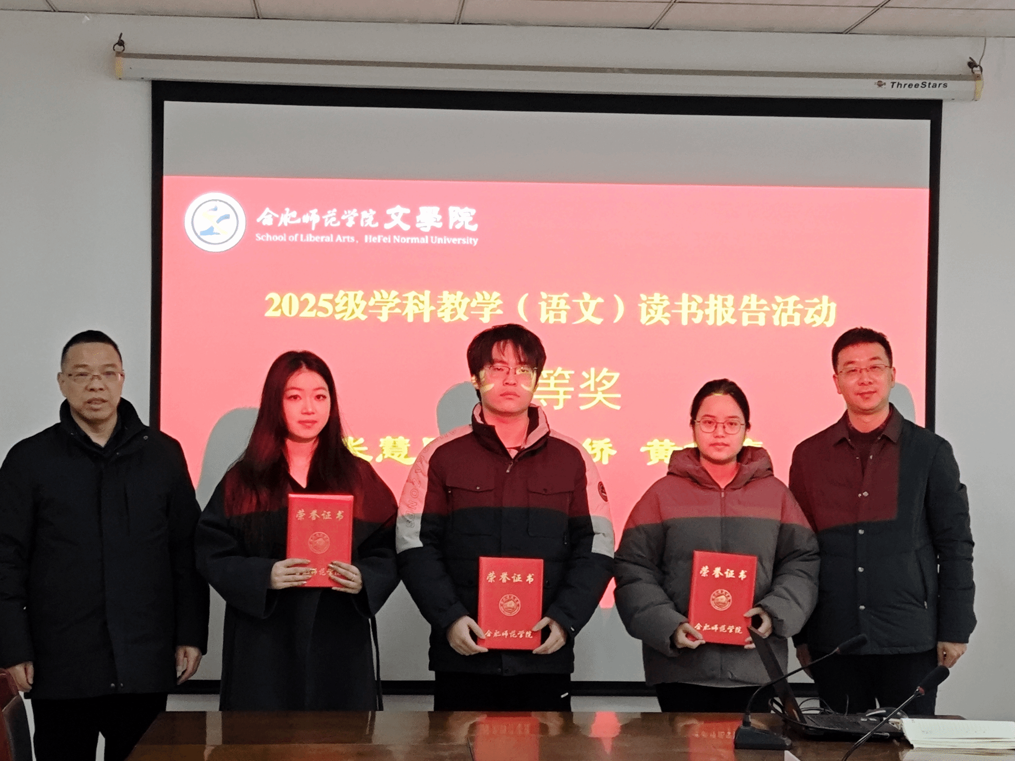 12月31日上午,文学院在行知楼802会议室举办读书报告会颁奖仪式。文学院党委书记许锃、院长何旺生、党委副书记夏娟,研究生工作部主任王妍、中文系党支部书记计丽、辅导员疏淑进参加颁奖仪式。颁奖环节,老师们为获奖同学颁发证书,鼓励全体研究生以此次活动为契机,持续保持阅读热情,深化学术研究。